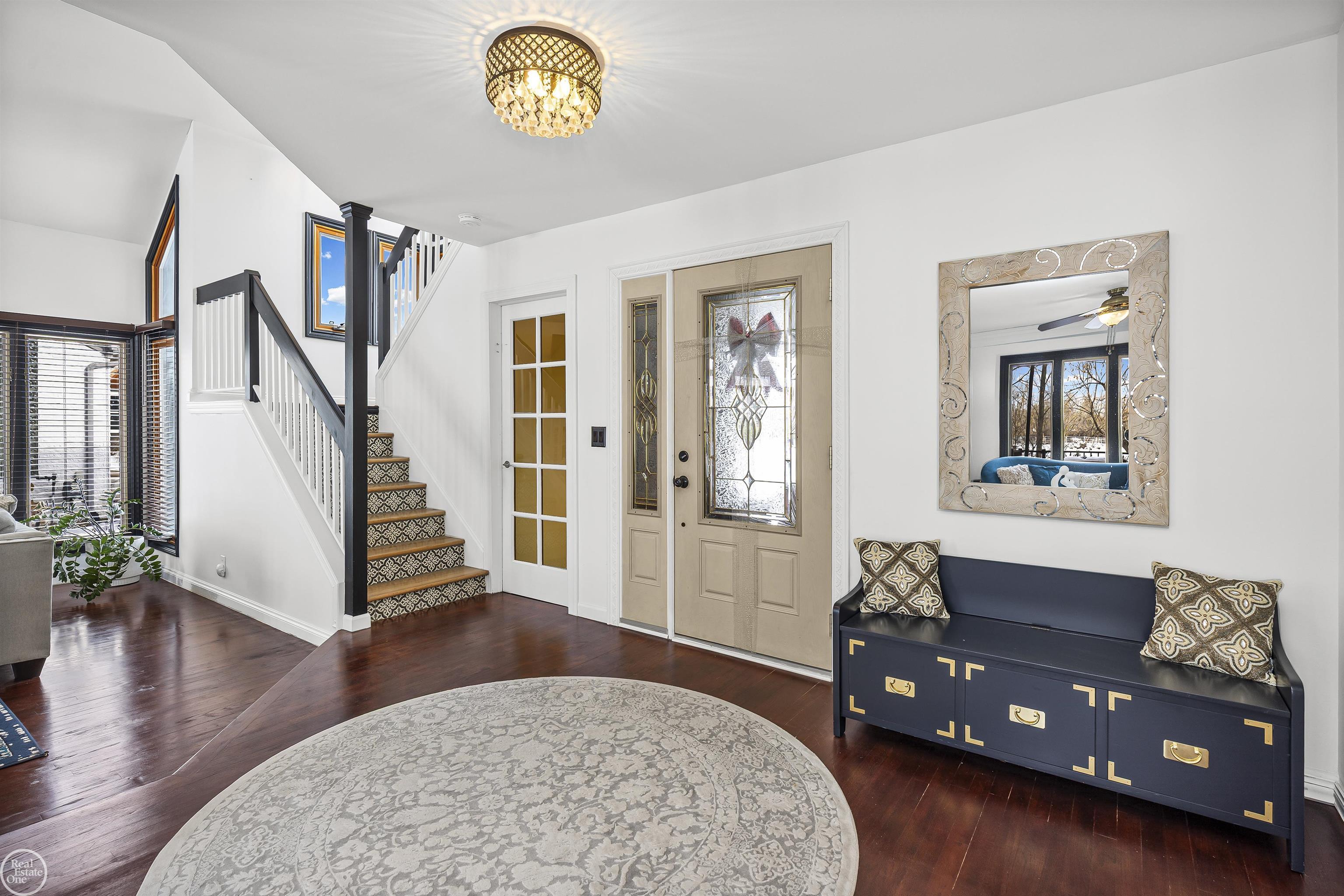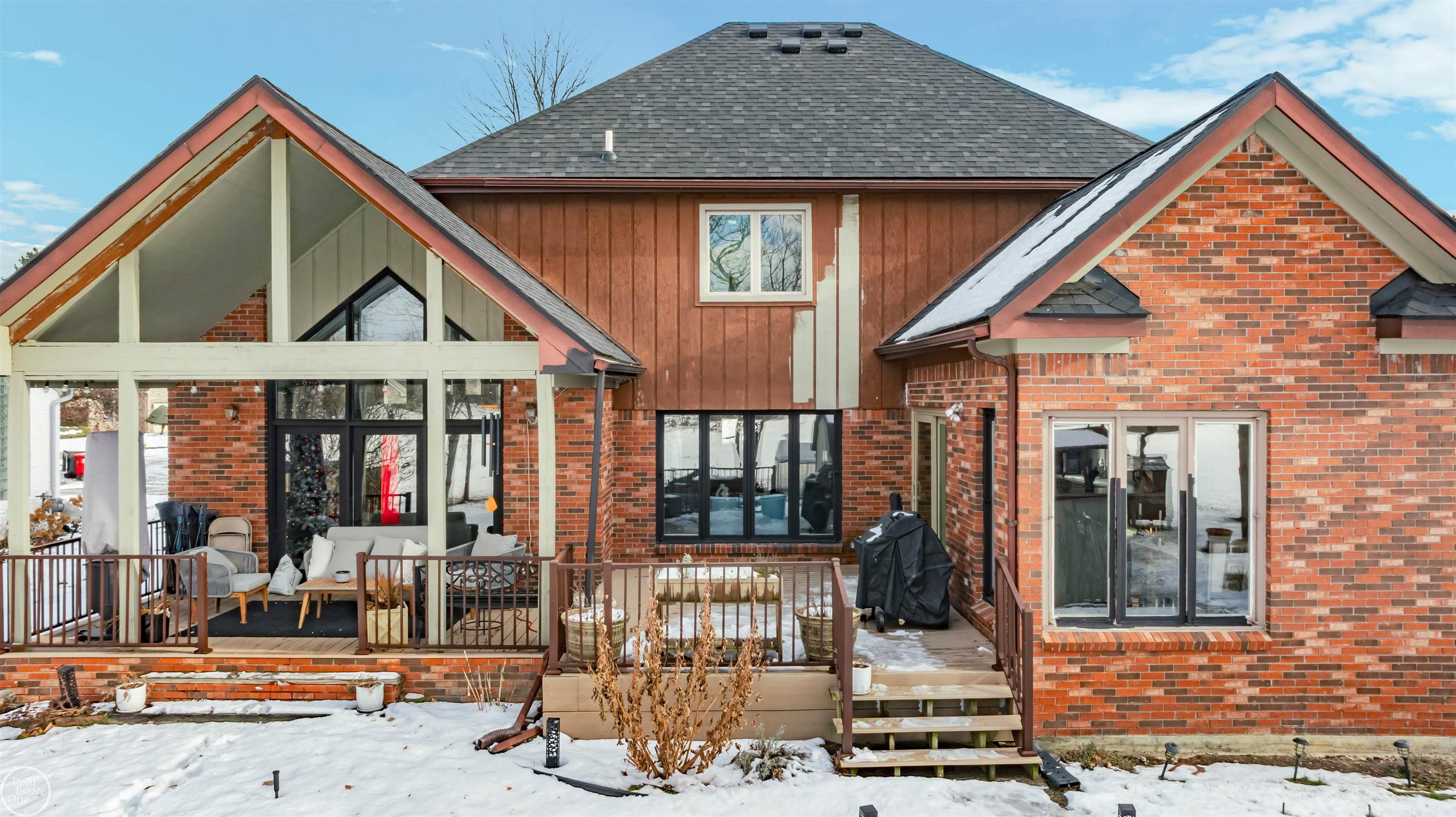Welcome to this exceptional custom colonial tucked away on a quiet cul-de-sac. This home offers serene views backing to beautiful horses and open space. This home has been extensively updated with a brand-new roof, freshly painted interior and exterior, new wood flooring throughout the entire second level, refinished first-floor hardwoods, a brand-new first-floor bath, and a brand-new second-floor full bath, along with a new surround on the great room fireplace. Soaring ceilings and oversized rooms create a light, open feel designed for comfortable everyday living and effortless entertaining. The impressive great room features oversized windows, a gas fireplace, hardwood flooring, and a doorwall leading to an oversized covered Trex deck overlooking a private backyard with picturesque views. The expansive kitchen offers plentiful cabinetry and a generous dining area with vaulted ceilings, exposed beams, and walls of windows that flood the space with natural light. A flexible front room can serve as a formal dining room or living room. Upstairs, enjoy all-new wood flooring, a spacious primary suite with a large private bath featuring a soaking tub and separate shower, plus a huge walk-in closet, two additional spacious bedrooms, a brand-new full bathroom, and a loft area ideal for a study or home office. The finished basement is an entertainer’s dream with a wet bar and gas fireplace, plus a large storage area. Additional highlights include first-floor laundry and an outstanding location just minutes from Partridge Creek, Chippewa Valley Schools. A rare opportunity combining privacy, updates, space, and an unbeatable setting. NO HOA